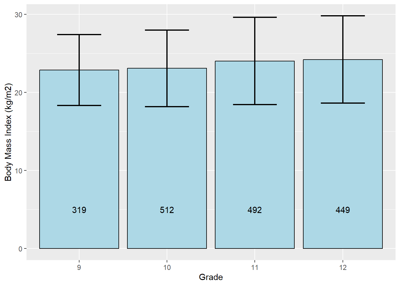 One option is to create a bar chart of grade but, instead of the number of children in each grade, the height of the bar will indicate the mean bmi of children in that grade. We will also include 1-standard-deviation error bars to visualize the variation in bmi within grade. This is best done using ggplot(). This example also demonstrates the use of geom_text() to add text (in this case, the number within each bar).