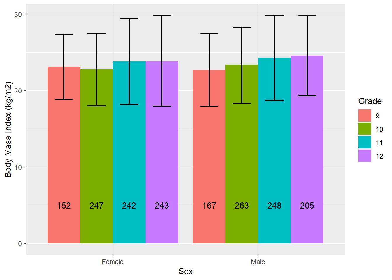 labs(y = "Body Mass Index (kg/m2)", fill = "Grade", x = "Sex")