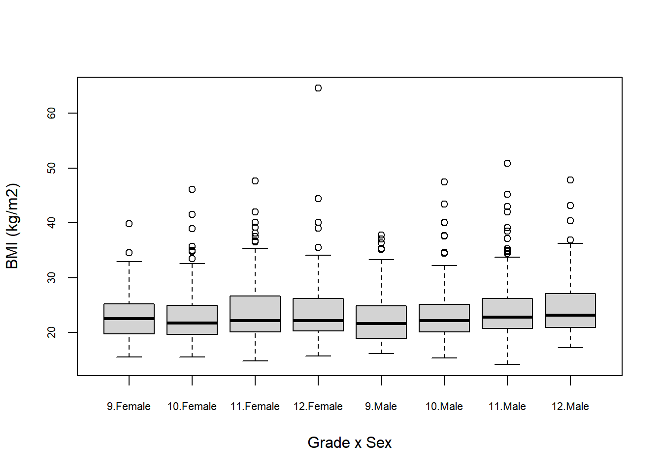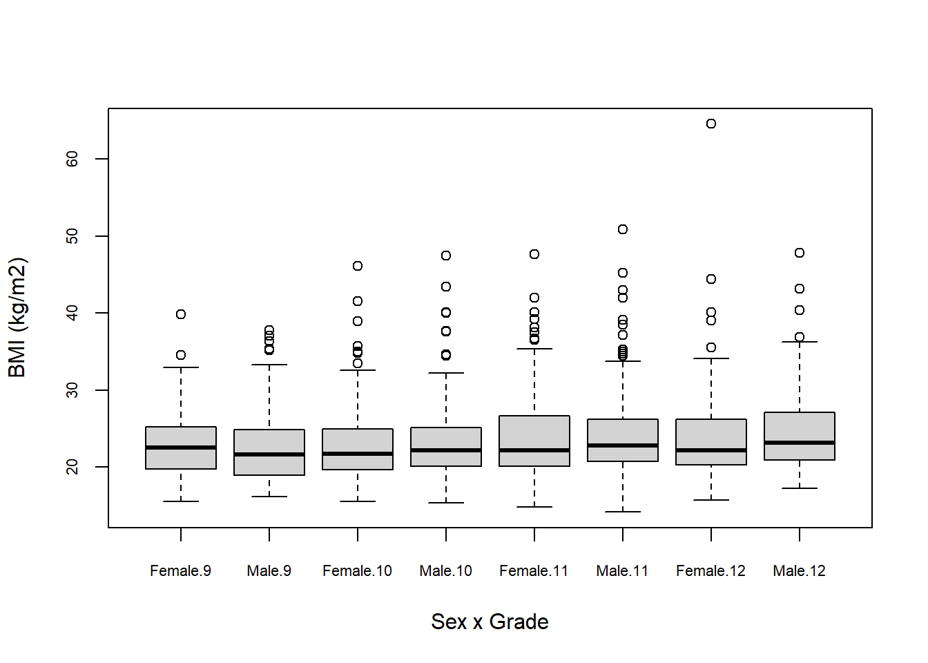 labs(y = "Body Mass Index (kg/m2)", x = "Grade", fill = "Sex")