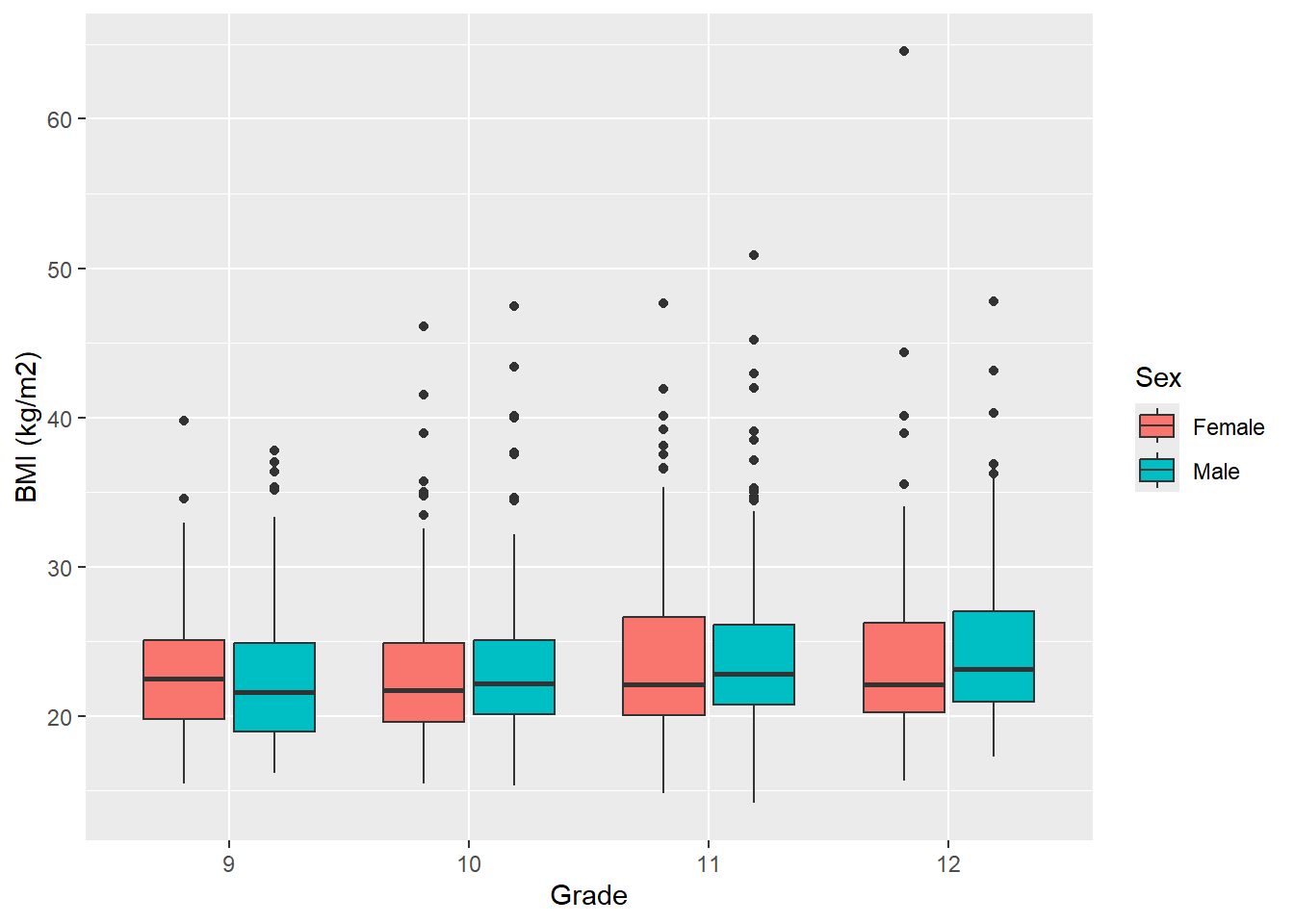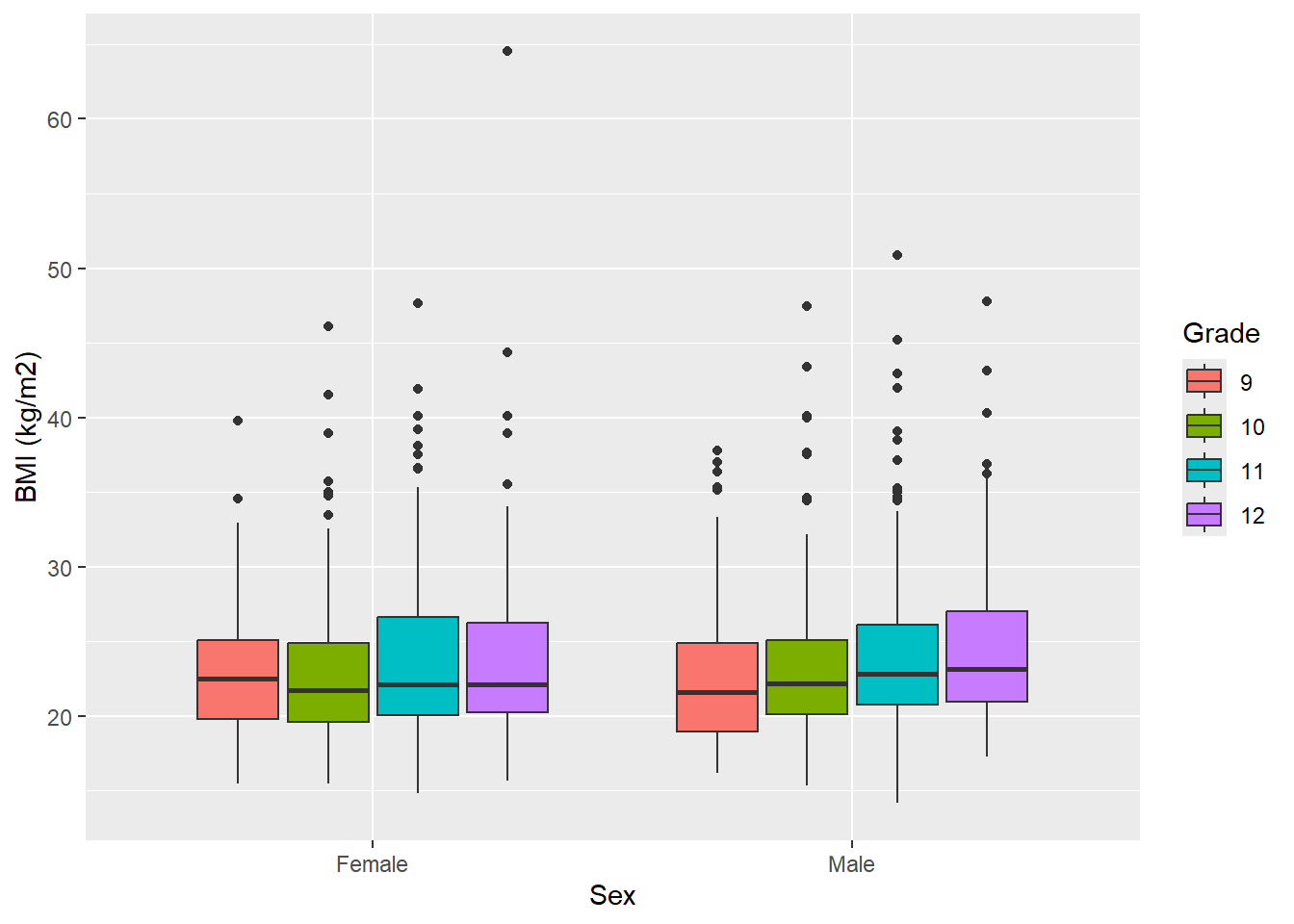 labs(y = "BMI (kg/m2)", x = "Grade", fill = "Sex")
