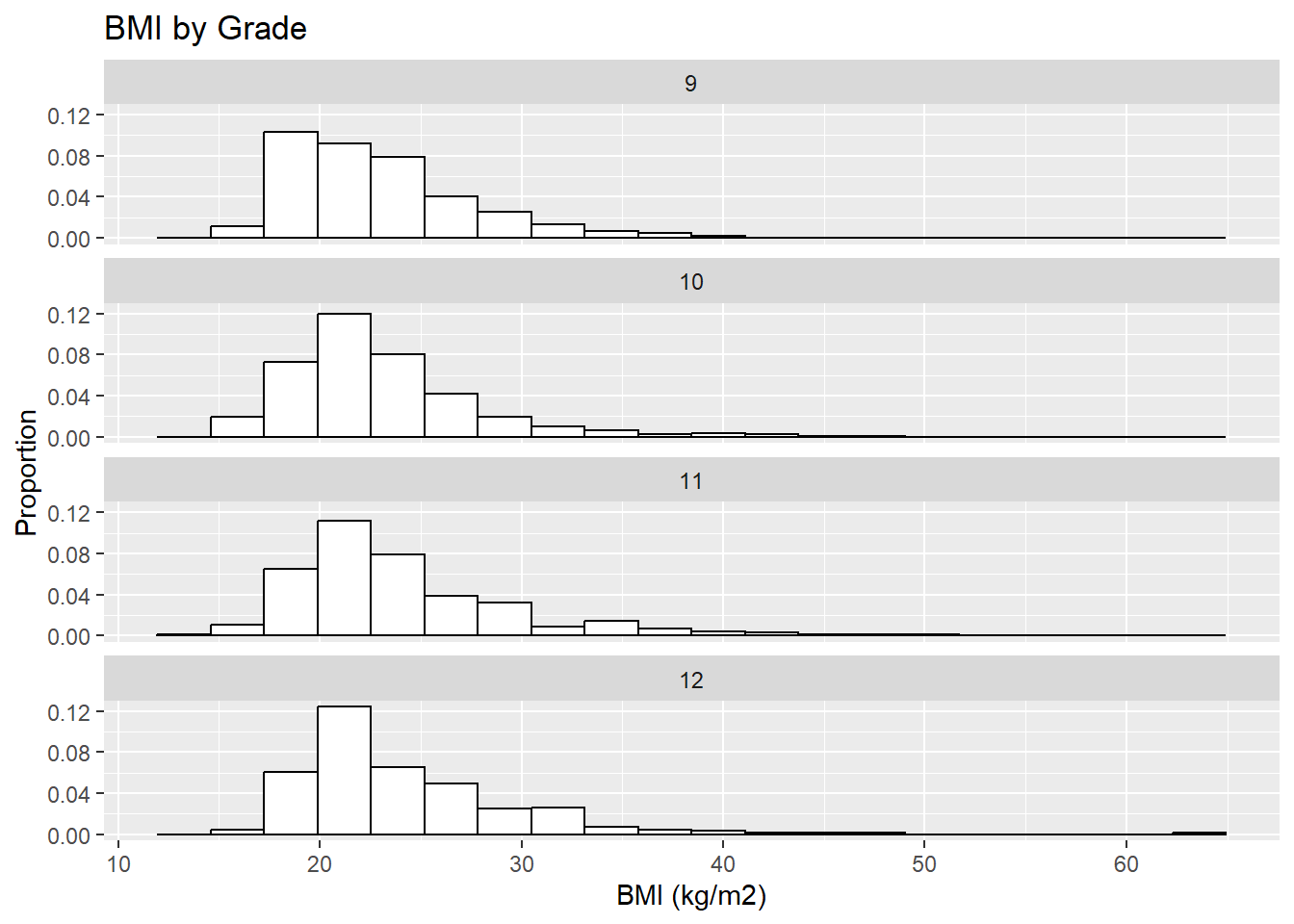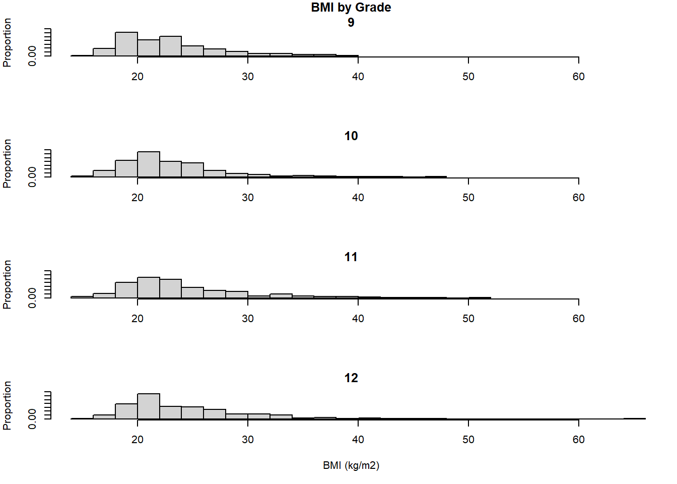 labs(x = "BMI (kg/m2)", y = "Proportion") +