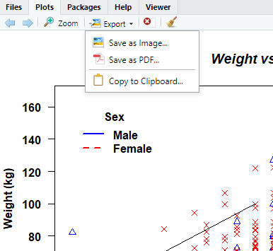 To copy or export a figure from RStudio, select the desired option from the Export menu in the Plots panel.