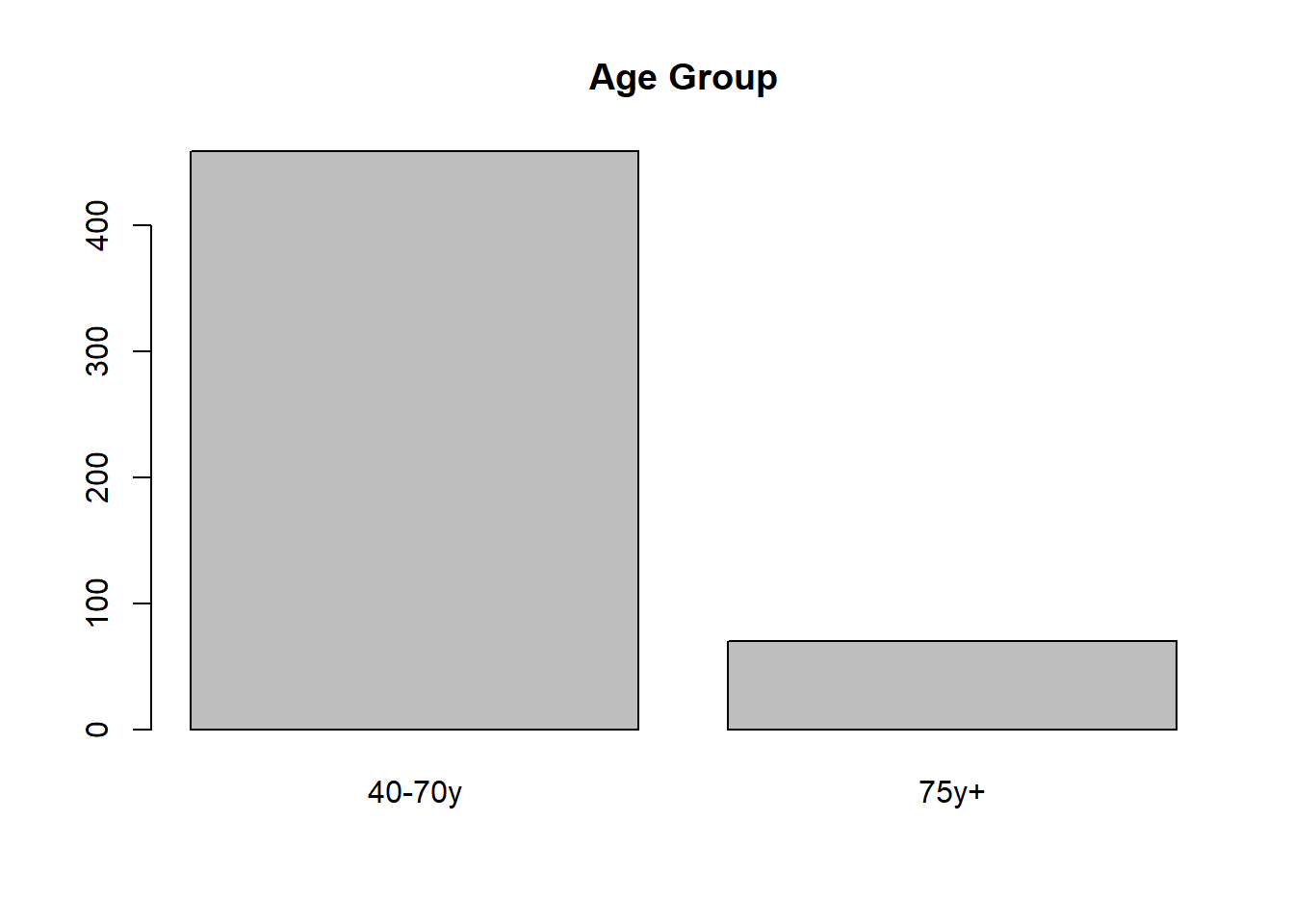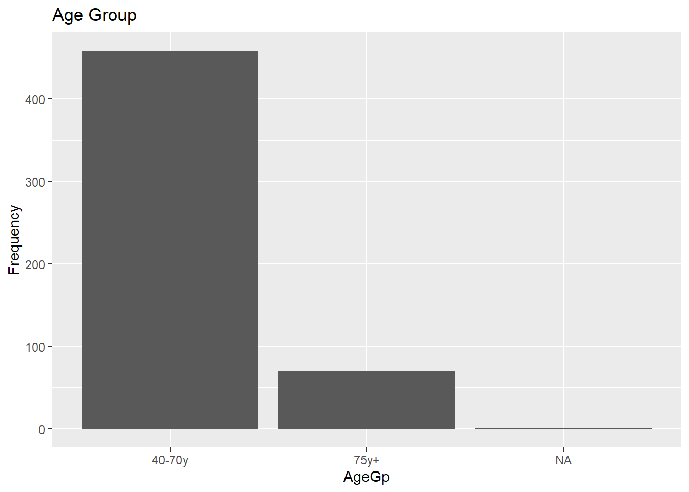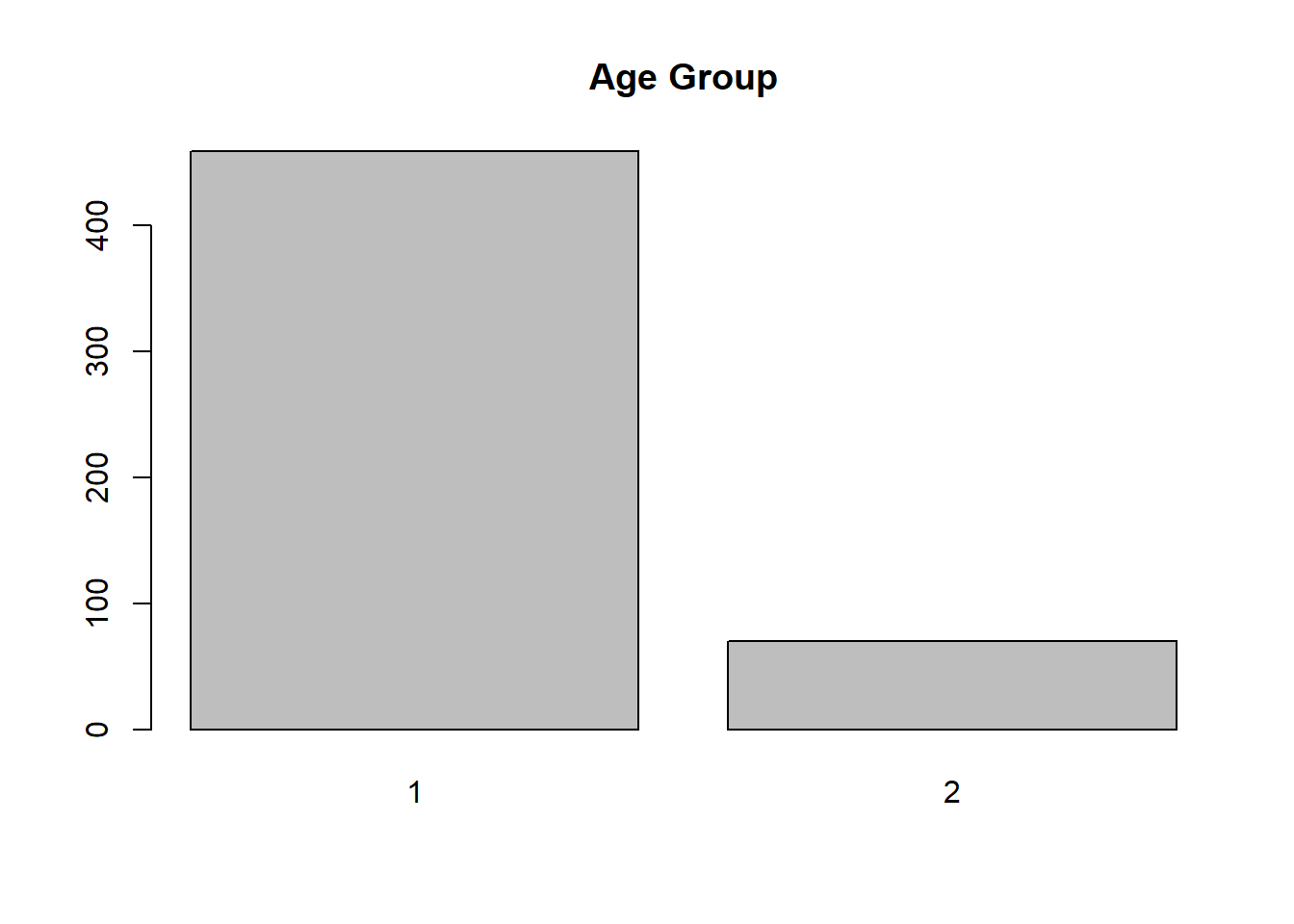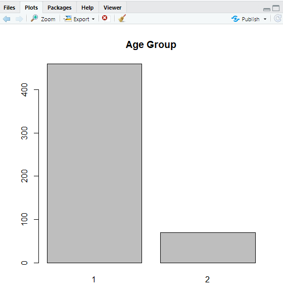 For a variable with only a few levels, a bar chart is appropriate. As we did previously, we will convert AgeGp to a factor before plotting.