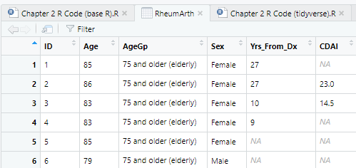 load("Data/RheumArth.RData")NOTE: The dataset name might not be the same as the file name! Look in the R Studio Environment window or use ls() to see the name of the file you loaded. Then, optionally, use View() to see the contents.